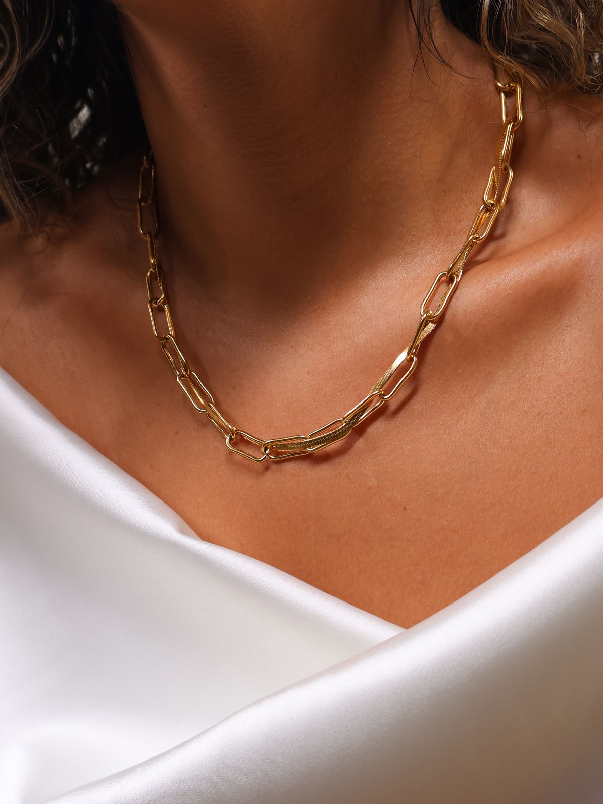 ترکیبی جذاب از مدل هرینگبن در کنار زنجیری بیضی که با توجه به کیفیت بالای آبکاری حس لوکس بودن رو بر روی گردن شما به نمایش میگذاره.